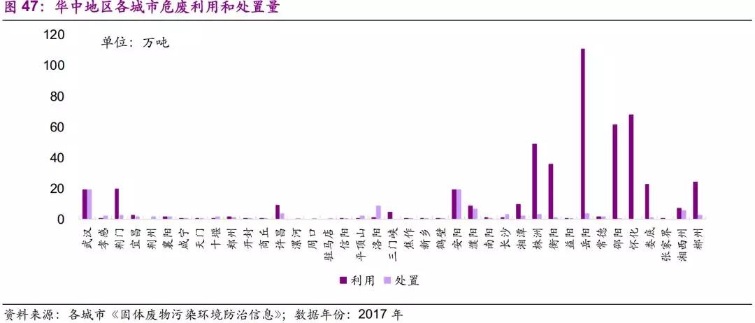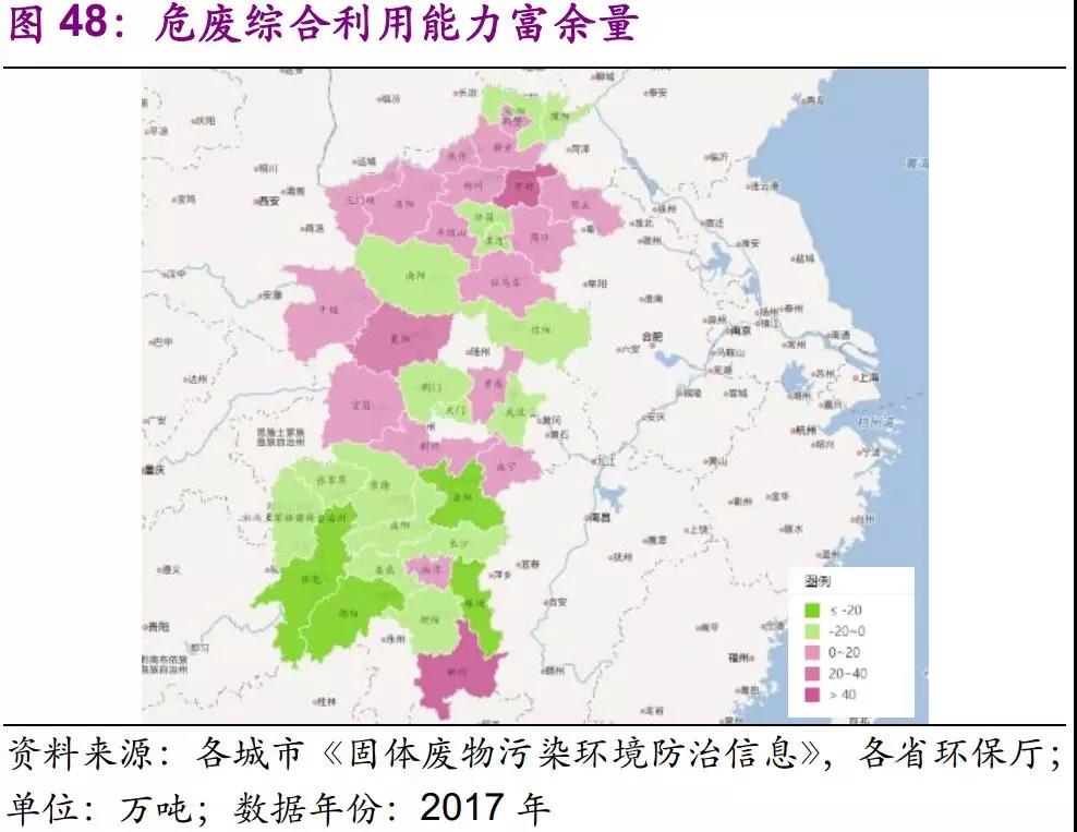 河南省利用產(chǎn)能過剩,處置產(chǎn)能短缺;湖北省整體平衡;湖南省利用產(chǎn)能短缺,利用產(chǎn)能短缺更多。從產(chǎn)能富余情況來看,河南省中部地區(qū)產(chǎn)能較為富余,南部地區(qū)產(chǎn)能普遍短缺。而湖北省則整體實現(xiàn)利用和處置產(chǎn)能匹配;而湖南省兩種產(chǎn)能都處于短缺狀態(tài),尤其在岳陽、邵陽、株洲等主導(dǎo)型城市最為嚴(yán)重。短缺的主要原因在于,實際利用和處置量遠(yuǎn)大于核準(zhǔn)產(chǎn)能。我們認(rèn)為,深層次原因在于,企業(yè)內(nèi)部處理的危廢量較多,對外部處置產(chǎn)能的需求相對較小。