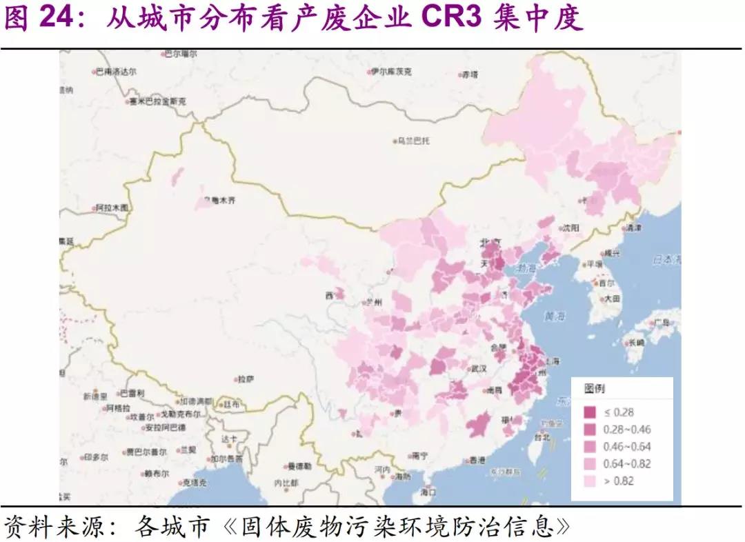 集中度上看,不管是危廢種類還是產(chǎn)廢企業(yè),西部、東北地區(qū)明顯大于東部沿海。
