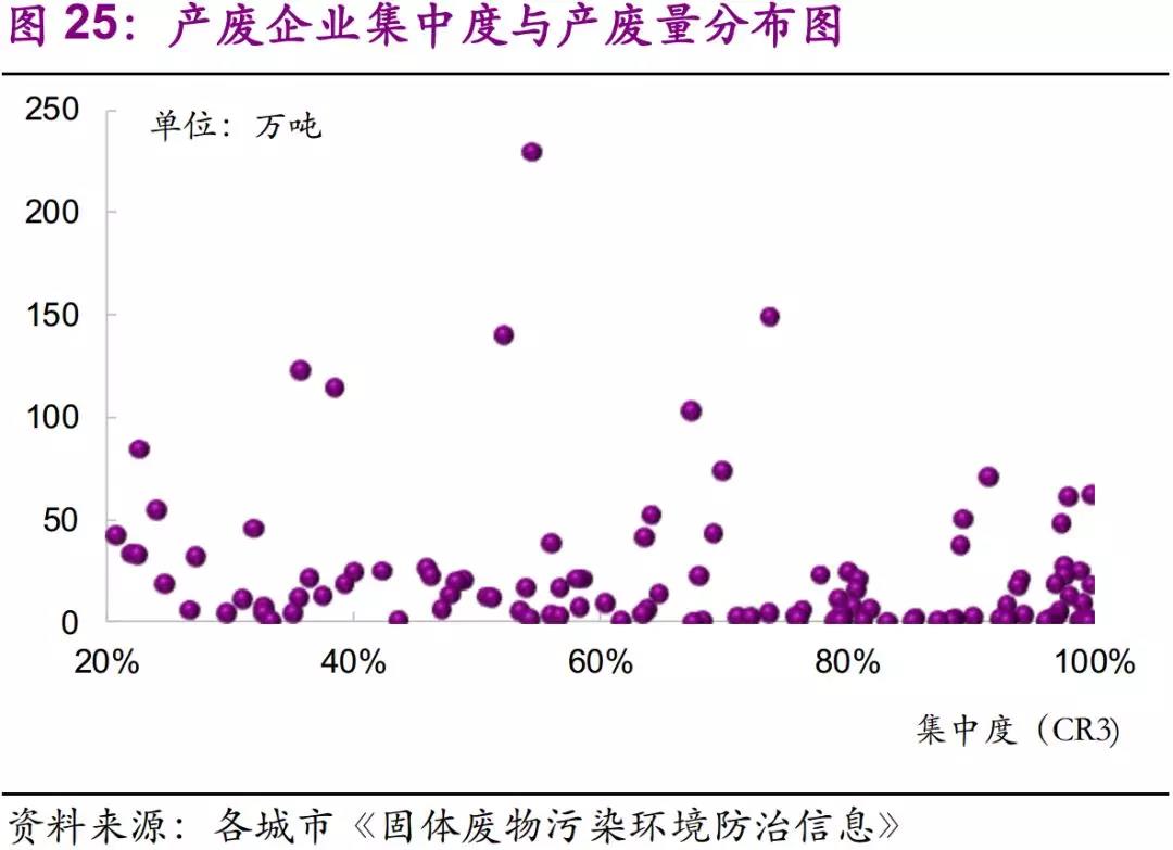 集中度高的影響:1)產(chǎn)廢企業(yè)產(chǎn)值占比較大,抗環(huán)保整治能力較強(qiáng),與政府有較強(qiáng)的話語權(quán);2)工業(yè)結(jié)構(gòu)較為單一,處置搭配簡單、單價低。