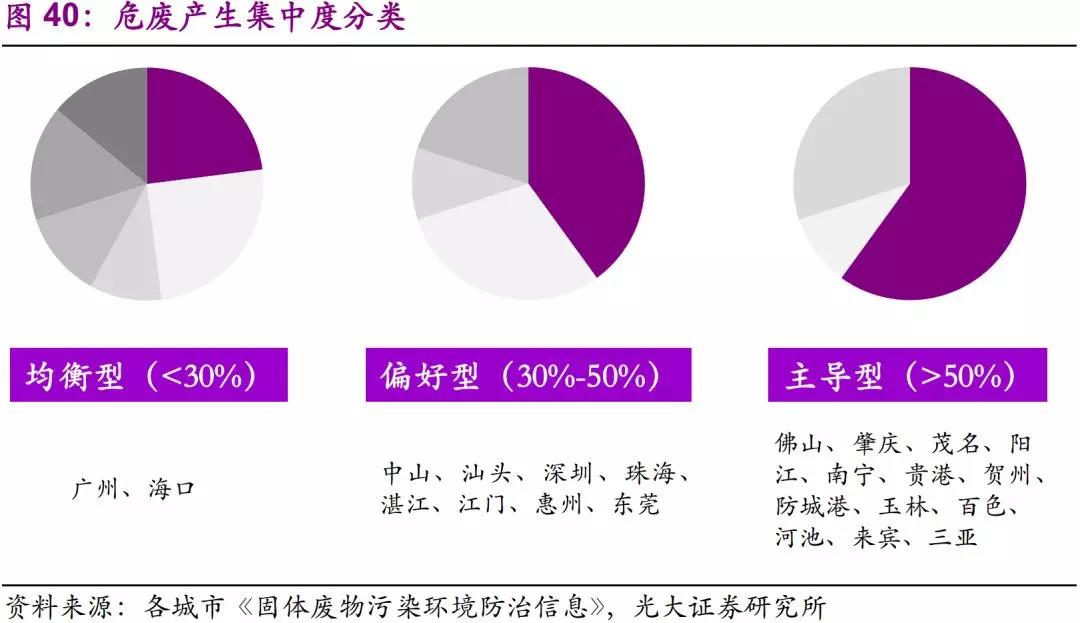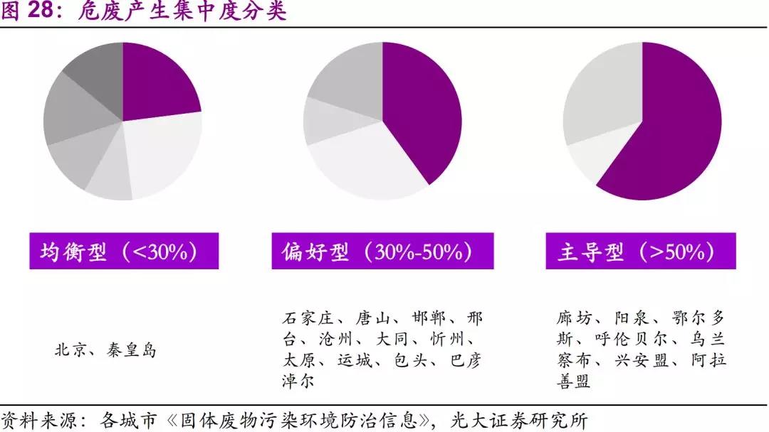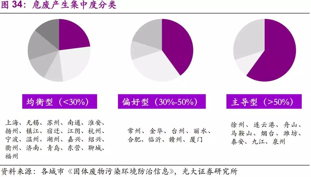從2017年各市危廢增速來看,東部沿海地區(qū)延續(xù)高景氣度。從危廢種類和產(chǎn)廢企業(yè)集中度來看,東部地區(qū)種類更復(fù)雜,處理工藝要求更高。從城市分類來看,均衡型城市處置需求最為復(fù)雜。