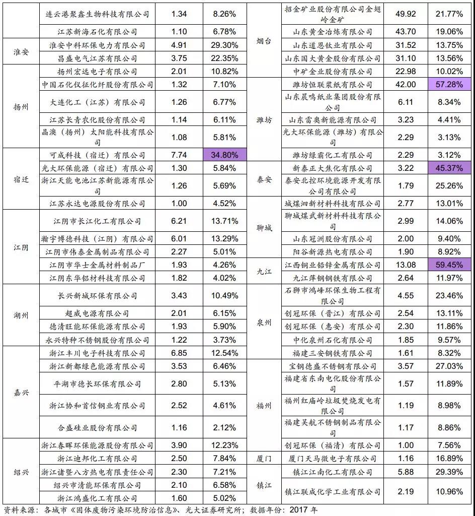 在偏好型和主導(dǎo)型城市中,產(chǎn)廢量占比較大的企業(yè)值得重點關(guān)注。如馬鞍山安徽金星鈦白(集團(tuán))有限公司(84%)、臨沂山東光華紙業(yè)集團(tuán)有限公司(40%)、麗水浙江省遂昌金礦有限公司(36%)。華東地區(qū)經(jīng)濟(jì)較為發(fā)達(dá),產(chǎn)業(yè)眾多,多為均衡型城市,主導(dǎo)型城市占比低。