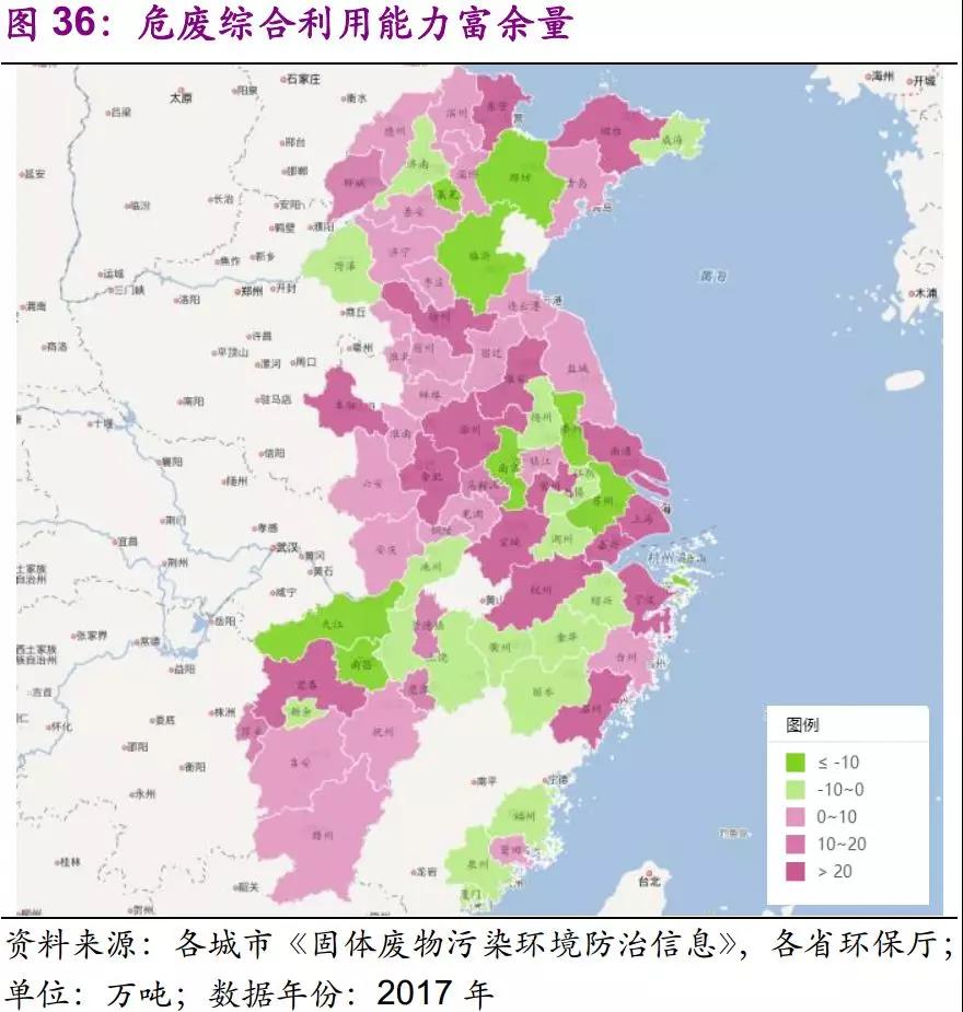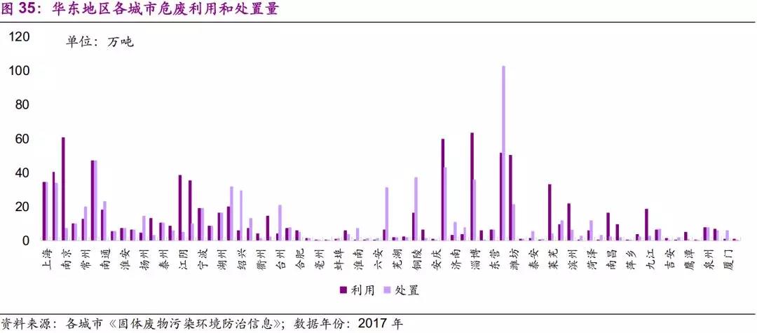華東地區(qū)產(chǎn)廢大市集中于長三角及山東地區(qū)。華東地區(qū)產(chǎn)業(yè)結(jié)構(gòu)較為完善,因此,各個城市對利用和處置產(chǎn)能的需求較為均衡。