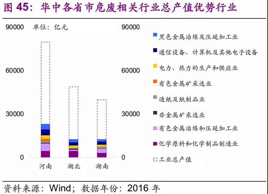 因此,我們認(rèn)為華中地區(qū)危廢種類較為復(fù)雜,建議關(guān)注有色金屬冶煉和壓延加工業(yè)及化學(xué)原料和化學(xué)制品制造業(yè)所產(chǎn)生的危廢,如有色金屬冶煉廢物、廢堿等。