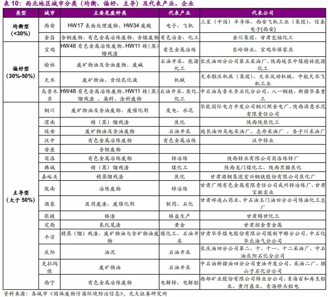因此,我們認(rèn)為西北地區(qū)應(yīng)重點關(guān)注有色金屬冶煉和壓延加工業(yè)及黑色金屬冶煉及壓延加工業(yè)所產(chǎn)生的危廢,如有色金屬冶煉廢物、廢酸等。