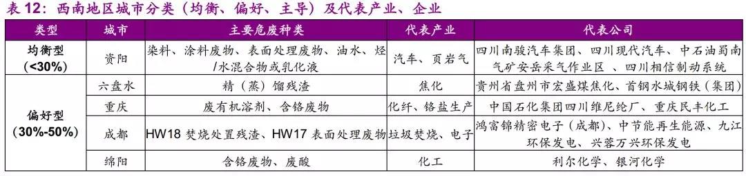 因此,我們認(rèn)為西南地區(qū)應(yīng)重點關(guān)注通信設(shè)備、計算機(jī)及其他電子設(shè)備制造業(yè)及黑色金屬冶煉及壓延加工業(yè)所產(chǎn)生的危廢,如含銅廢物、廢酸等。此外,貴州、云南作為有色金屬大省,工業(yè)總產(chǎn)值不高,但相關(guān)產(chǎn)業(yè)發(fā)達(dá),也需要重點關(guān)注。