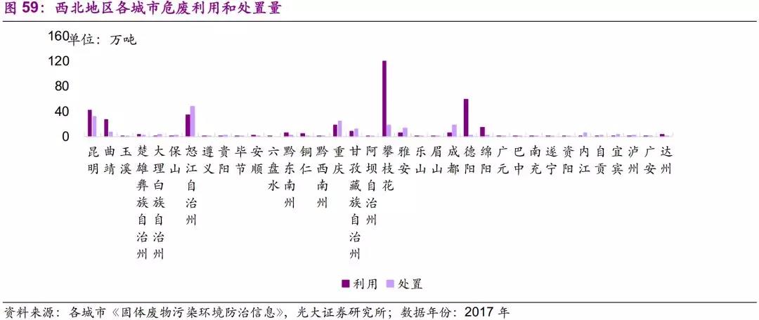 西南地區(qū)大部分城市產(chǎn)廢量較小,危廢產(chǎn)量集中于數(shù)個產(chǎn)廢大市,集中度較高。產(chǎn)廢量最大的兩個城市,攀枝花和德陽,均為鈦白粉產(chǎn)業(yè)主導(dǎo)型城市,危廢產(chǎn)物為廢酸,均實現(xiàn)綜合利用。而以怒江、雅安為代表的有色金屬冶煉主導(dǎo)型城市,危廢利用和處置量基本持平。