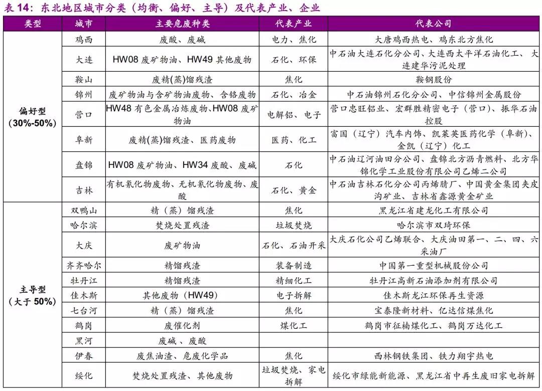 東北地區(qū)無均衡型城市,整體產(chǎn)業(yè)分為:1)石化、化工,如大連、阜新、盤錦、吉林、大慶等;2)煤、鋼產(chǎn)業(yè),如雞西、鞍山、雙鴨山、本溪、七臺河、伊春等。產(chǎn)廢量占所在城市產(chǎn)廢量比例較大的企業(yè)有:雙鴨山黑龍江省建龍化工有限公司(90%)、齊齊哈爾中國第一重型機(jī)械股份公司(72%)、鞍山鞍鋼股份有限公司(95%)、葫蘆島中冶葫蘆島有色金屬有限公司(68%)、吉林中石油吉林石化分公司丙烯腈廠(57%)等。