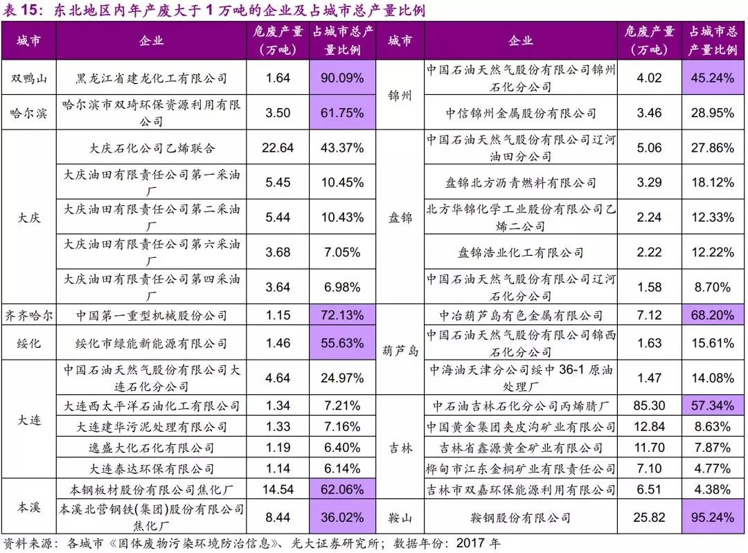 因此,我們認(rèn)為東北地區(qū)應(yīng)重點關(guān)注黑色金屬冶煉及壓延加工業(yè)和石油加工、煉焦及核燃料加工業(yè)所產(chǎn)生的危廢,如廢礦物油、蒸餾(精餾)殘渣等。