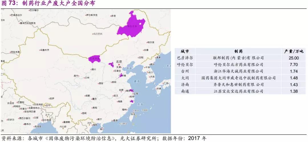 制藥行業(yè)普遍產(chǎn)廢量較小,進(jìn)入城市發(fā)布名單(前10名或前5名)的企業(yè)較少。納入統(tǒng)計的企業(yè)中,除內(nèi)蒙古聯(lián)邦制藥(內(nèi)蒙古)有限公司(25萬噸)、呼倫貝爾北方藥業(yè)有限公司(7.7萬噸)以外,其余企業(yè)年危廢產(chǎn)量均在1萬噸左右。