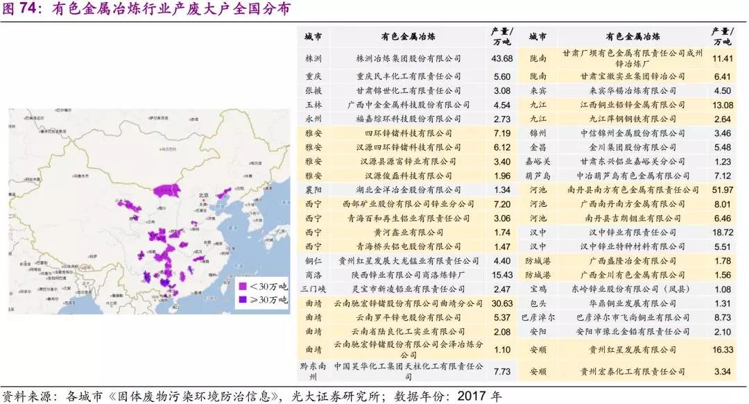 有色金屬冶煉大戶主要分布于西部地區(qū)。從湖南、貴州、廣西、云南、四川到陜西、甘肅、內(nèi)蒙古均有廣泛分布。其中產(chǎn)廢量較大的企業(yè)有株洲冶煉集團(tuán)股份有限公司(44萬噸)、陜西鋅業(yè)有限公司商洛煉鋅廠(15萬噸)、云南馳宏鋅鍺股份有限公司曲靖分公司(31萬噸)、南丹縣南方有色金屬有限責(zé)任公司(52萬噸)、漢中鋅業(yè)有限責(zé)任公司(19萬噸)、貴州紅星發(fā)展有限公司(16萬噸)。在雅安、安順、銅仁、曲靖等城市,有色金屬冶煉行業(yè)占據(jù)主導(dǎo)地位。