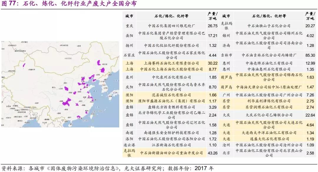 煉化企業(yè)主要分布于東北、山東、江蘇、川渝等地,基本上是中石油、中石化分公司。產(chǎn)廢量較大的企業(yè)有中國石化集團(tuán)四川維尼綸廠(27萬噸)、上海賽科石油化工有限責(zé)任公司(30萬噸)、中石油新疆油田分公司重油開發(fā)公司(43萬噸)、中石油吉林石化分公司丙烯腈廠(85萬噸)。