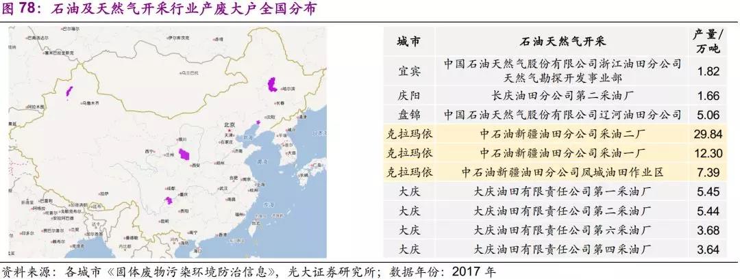 石油及天然氣開采行業(yè)主要分布于我國幾大油田,如長慶油田、大慶油田、克拉瑪依油田、遼河油田等。另外,隨著頁巖氣開發(fā)逐步推進(jìn),川渝地區(qū)也將成為成為油田危廢的重要產(chǎn)地,2017年宜賓市中石油天然氣勘探開發(fā)事業(yè)部產(chǎn)生危廢1.8萬噸。而克拉瑪依中石油新疆油田第一、二采油廠及鳳城油田作業(yè)區(qū)共產(chǎn)生危廢近50萬噸,遠(yuǎn)超其他油田產(chǎn)量。