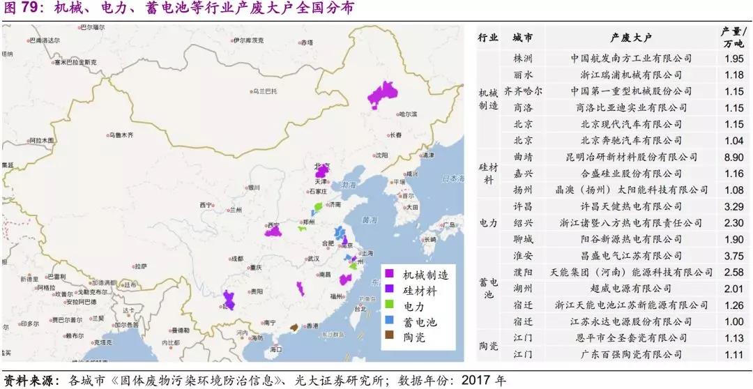 機(jī)械、電力、硅材料、蓄電池、陶瓷等細(xì)分行業(yè)分布較為廣泛。通常情況下,單廠危廢產(chǎn)量較小,進(jìn)入各市《固體廢物污染環(huán)境防治公告》的企業(yè)較少。而通過行業(yè)中體量較大的企業(yè),則可以推測出整體產(chǎn)廢水平。如機(jī)械行業(yè),齊齊哈爾中國第一重型機(jī)械股份公司2017年危廢產(chǎn)量1.2萬噸;蓄電池行業(yè),湖州超威電源有限公司2017年產(chǎn)危廢2萬噸。