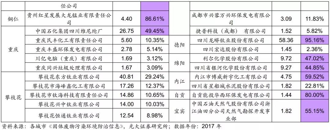 西南地區(qū)以主導(dǎo)型城市為主,多數(shù)城市產(chǎn)廢量較小,且種類單一。主要產(chǎn)業(yè)有:1)有色金屬冶煉,如曲靖、銅仁、怒江、雅安、安順;2)鈦白粉產(chǎn)業(yè),如攀枝花、德陽。產(chǎn)廢量占所在城市產(chǎn)廢量比例較大的企業(yè)有:曲靖云南馳宏鋅鍺股份有限公司曲靖分公司(60%)、安順貴州紅星發(fā)展有限公司(83%)、黔東南州中國昊華化工集團(tuán)天柱化工有限責(zé)任公司(98%)、銅仁貴州紅星發(fā)展大龍錳業(yè)有限責(zé)任公司(87%)、德陽四川龍蟒鈦業(yè)股份有限公司(95%)。