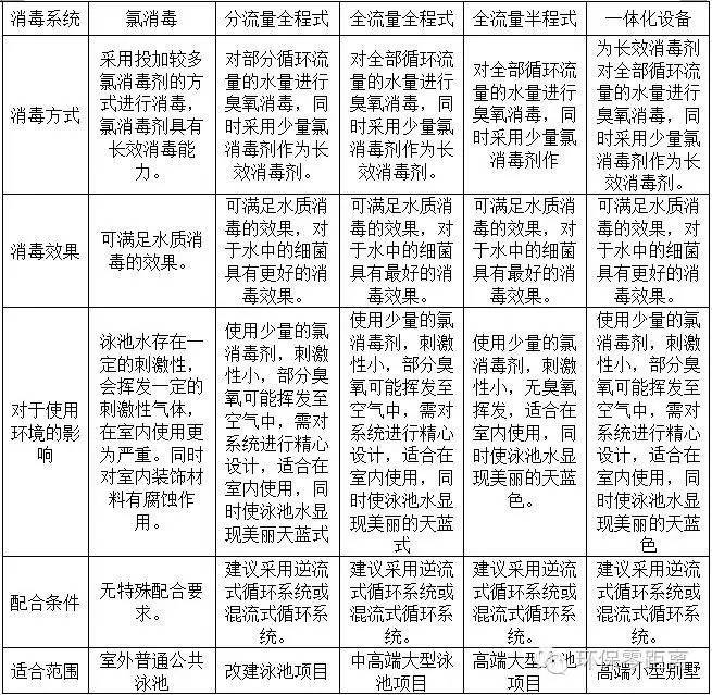游泳池水處理系統(tǒng)的一個(gè)重要組成部分是消毒系統(tǒng),常用的消毒系統(tǒng)有氯消毒系統(tǒng)、臭氧消毒系統(tǒng)等。其中臭氧消毒系統(tǒng)從消毒量來分有全流量臭氧消毒系統(tǒng)和分流量臭氧消毒系統(tǒng)兩大系列;從消毒流程來分有全程式及半程式兩種;同時(shí),為了適應(yīng)新的發(fā)展,目前出現(xiàn)了一種一體化臭氧消毒設(shè)備。這些消毒系統(tǒng)的特點(diǎn)具體見下表: