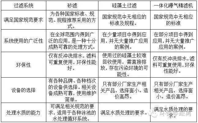 泳池過濾系統(tǒng)為循環(huán)處理系統(tǒng)的重要組成部分,該系統(tǒng)的選擇直接影響著游泳池水處理系統(tǒng)是否滿足使用要求。現(xiàn)在的過濾系統(tǒng)有砂濾、硅藻土過濾、一體化曝氣精濾機(jī)等,他們各有特點(diǎn),具體的分析見下表。
