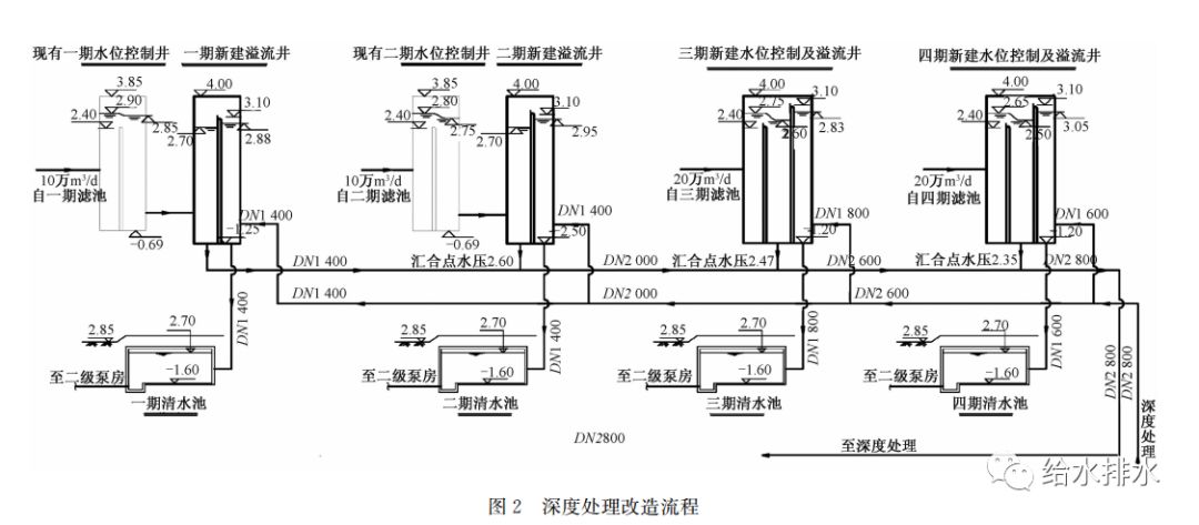 (1)現(xiàn)有各流程運(yùn)行獨(dú)立性。一期~四期出水接入深度處理的總管接管點處最高水壓受到調(diào)節(jié)水池水位和輸送流量的變化影響。各期濾池和沖洗泵房的運(yùn)行需要排除接管點水壓變化的干擾,保證自身工藝流程運(yùn)行的穩(wěn)定性?,F(xiàn)狀一期和二期設(shè)有濾池出水堰和反沖洗泵房進(jìn)水所需水位控制井,但三期和四期僅設(shè)有濾池出水堰,而無反沖洗水位控制井。因此,當(dāng)深度處理調(diào)節(jié)水池水位變化時,不會影響一期和二期的正常運(yùn)行,而三期和四期沖洗水位無法保證。本次工程為三期和四期設(shè)置專門的沖洗水位控制措施——水位控制堰,保證沖洗水位。各期正常運(yùn)行進(jìn)入深度處理的水位控制高程及相應(yīng)工程措施,見工藝流程圖2。