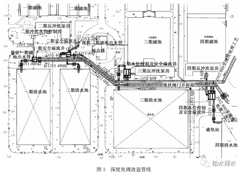 (3)各期流程應(yīng)保持進(jìn)出水均衡。由于各期至深度處理系統(tǒng)的距離相差較大,在滿足最遠(yuǎn)的一期工程水力高程需要時,工程設(shè)計應(yīng)采取相應(yīng)措施,確保各期進(jìn)入深度處理以及深度處理出水回到各期清水池輸送水量的均衡,使清水池調(diào)蓄量利用充分。