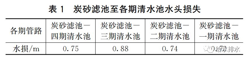 (2)深度處理出水均衡返回。由于各期清水池距離相差較大,深度處理出水至各清水池的水頭損失差需要控制,以保證清水池容積的充分利用和不浪費(fèi)水頭。本工程適當(dāng)優(yōu)化放大至各清水池的管徑(見圖3),設(shè)計計算各期清水池進(jìn)水水頭見表1。其中三期清水池接入管道最為復(fù)雜,以其水損最大為0.88 m。但各期相差數(shù)值較小,滿負(fù)荷運(yùn)行時,最大水損差值僅為0.15 m,基本可以不考慮其影響,能確保深度處理出水均衡返回,清水池容積可以得到充分利用。