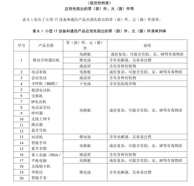 《編制說明》指出,現(xiàn)行規(guī)范性文件并未對移動通信手持機、電話單機這類小型廢棄電器電子產品設立處理標準。因此,為貫徹落實《廢棄電器電子產品回收處理管理條例》的相關規(guī)定,填補國內技術標準空白,有必要通過設立國家標準的方式提出移動通信手持機、電話單機這類小型產品的拆解處理要求??紤]到平板電腦、掌上電腦等小型產品存在納入《廢棄電器電子產品處理目錄》的可能性,且結構尺寸和拆解處理工藝相似,標準提出了對外部任意一邊外形尺寸不超過50cm的IT設備和通信產品的統(tǒng)一拆解處理要求。