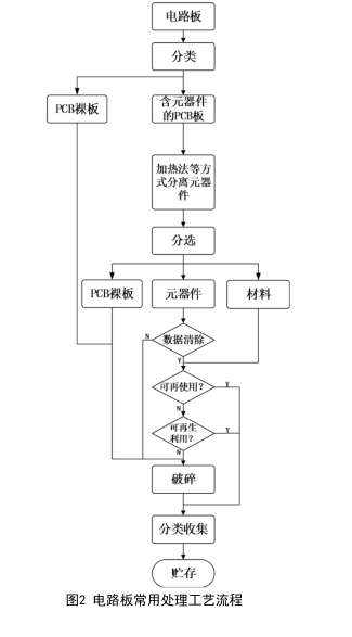 電路板的處理可采用破碎、分選、火法或濕法冶金等技術,電路板常用處理工藝流程如圖所示。