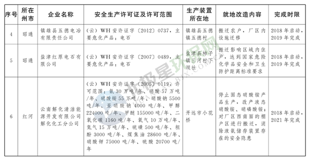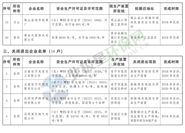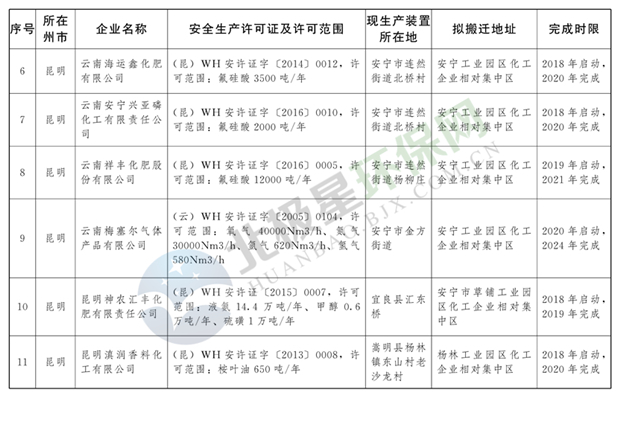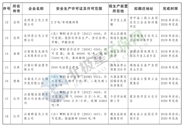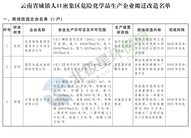 日前云南省人民政府發(fā)布了《云南省城鎮(zhèn)人口密集區(qū)危險化學(xué)品生產(chǎn)企業(yè)搬遷改造名單》,其中就地改造企業(yè)6戶,搬遷入園企業(yè)20戶,關(guān)閉退出企業(yè)16戶,具體名單見正文: