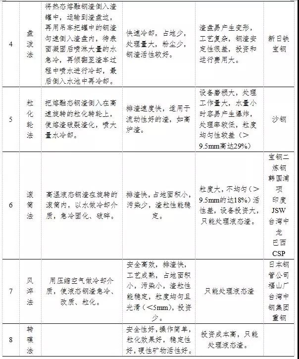 鋼渣的一次處理各種工藝均有利弊,選擇何種處理工藝需要從鋼渣的特性以及終端利用方式、對處理后粒度的要求、項目的節(jié)能環(huán)保要求、項目投資大小等方面綜合考慮。例如,如果鋼渣的流動性差,則不能使用滾筒法、風(fēng)淬法、水淬法和?;喎?,而盤潑法、熱潑法和熱悶法可以適用;如果從節(jié)能環(huán)保方面考慮,滾筒法和熱悶法較為適宜。
