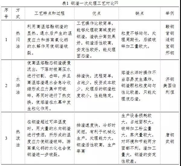 鋼渣的一次處理是把熱熔渣處理成粒徑符合一定要求的常溫塊渣,以有利于鋼渣的二次處理。目前國內(nèi)鋼渣一次處理主要工藝有:熱潑法、風(fēng)淬法、滾筒法、?;喎?、熱悶法等,其中熱潑法、滾筒法、熱悶法最為常用。表1綜合比較了各種工藝的特點。