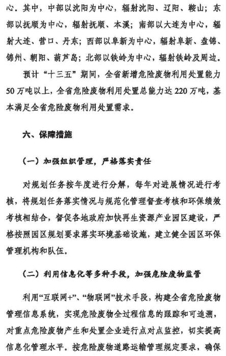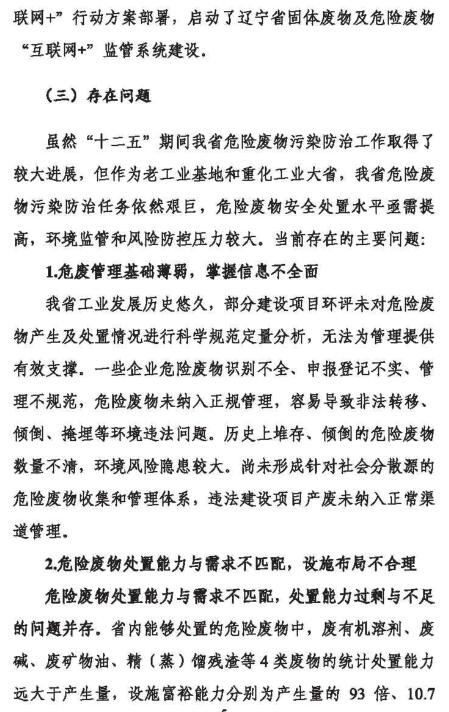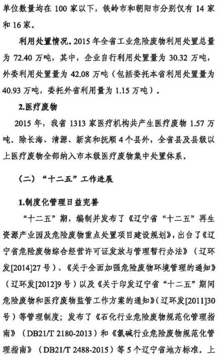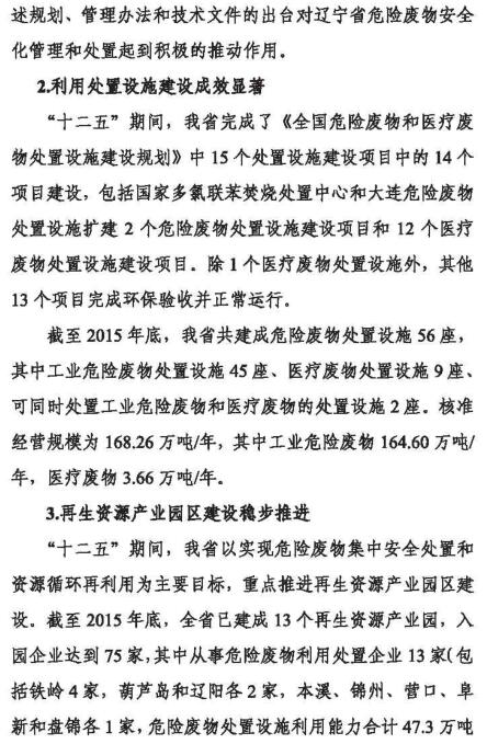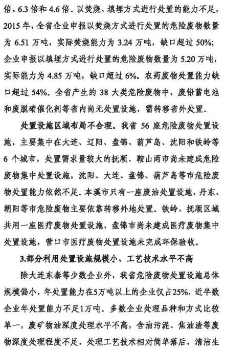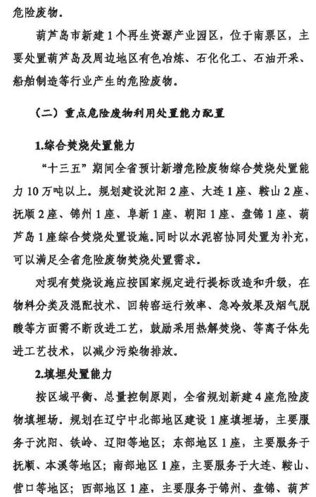 日前,遼寧環(huán)保廳公布了《遼寧省“十三五”危險廢物污染防治規(guī)劃》,預(yù)計(jì)“十三五”期間危險廢物利用處置設(shè)施建設(shè)資金投入達(dá)20億元以上,全省新增危險廢物處置能力50萬噸以上,全省危險廢物利用處置總能力達(dá)220萬噸,基本滿足全省危險廢物利用處置需求。