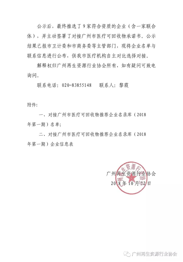 公示后,最終推選了9家符合資質的企業(yè)(含一家聯(lián)合體),并主動簽署了對接廣州市醫(yī)療可回收物承諾書。公示結果已報市衛(wèi)計委和市商務委等主管部門,現(xiàn)將企業(yè)名單與聯(lián)系信息進行公布,供我市醫(yī)療機構自主對比選擇對接。