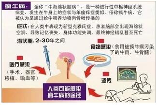 食用被瘋牛病污染了的牛肉、牛脊髓的人,有可能染上致命的克羅伊茨費(fèi)爾德—雅各布氏癥(簡(jiǎn)稱(chēng)克-雅氏癥),其典型臨床癥狀為出現(xiàn)癡呆或神經(jīng)錯(cuò)亂,視覺(jué)模糊,平衡障礙,肌肉收縮等。病人最終因精神錯(cuò)亂而死亡。