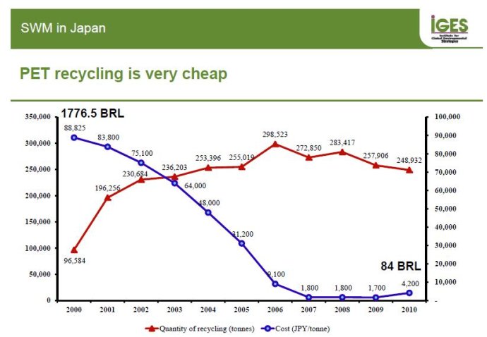 2)國內(nèi)常常傳頌這樣的說法,感嘆日本分類如何細(xì)致甚至極致。比如說PET塑料瓶,扔之前需要喝光、去掉瓶蓋,撕掉標(biāo)簽、踩扁瓶子。這樣的行為不僅值得敬仰,當(dāng)然也值得學(xué)習(xí)。但需要思考的是,這樣做的目的是什么,是分類收集,還是為了資源回收利用?日本是比中國資源短缺的國家,日本的石油主要依靠進口。我們想當(dāng)然地會認(rèn)為日本回收的塑料瓶應(yīng)該作為替代石油原料進行回收利用,可事實日本回收這些廢塑料主要是為了出口,而且主要是出口到中國。從經(jīng)濟角度分析,日本投放PET塑料瓶的行為,這是為了降低廢PET加工成本,出口到中國具有更好的競爭力。日本的一項研究報告顯示,在2000年日本PET塑料瓶的回收成本是800多美元每噸,而到了2008年前后,這一回收成本降到10多美元每噸,這恐怕就是撕掉塑料瓶標(biāo)簽的貢獻。這樣的行為與其說是分類收集、環(huán)保意識,不如說日本的民族意識或集體意識更確切。