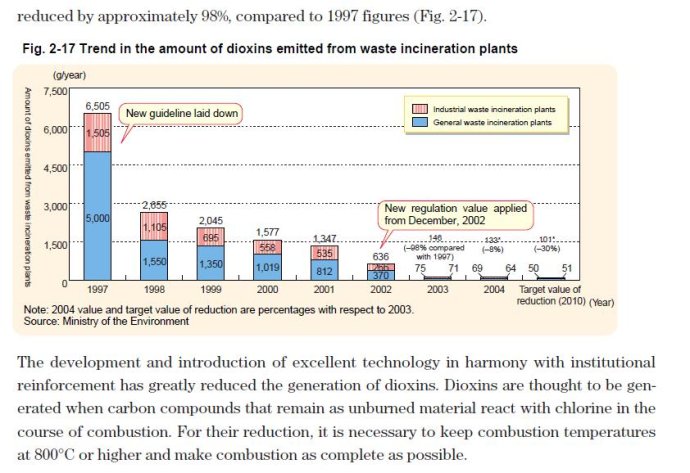 3)國內(nèi)有些人想當(dāng)然的認(rèn)為,日本垃圾焚燒二惡英排放量大幅度下降是由于生活垃圾分類收集做得好。根據(jù)日本環(huán)境部發(fā)布的建設(shè)循環(huán)型型社會白皮書(technologies to support a sound material-cycle society-development of 3R and waste management technologies 日本環(huán)境部, 2007),日本生活垃圾焚燒廠二惡英年排放量由5000ngTEQ(1997年)下降到71 ngTEQ(2003年)、52 ngTEQ(2007年),分別下降98%、99%。日本環(huán)境部總結(jié)生活垃圾焚燒二惡英大幅度下降的原因:執(zhí)行嚴(yán)格的標(biāo)準(zhǔn)、淘汰或關(guān)停不達標(biāo)的生活垃圾焚燒廠、保障生活垃圾在800度以上穩(wěn)定燃燒,煙氣快速冷卻以及煙氣處理。要保障生活垃圾在800度以上穩(wěn)定燃燒,工藝技術(shù)上要實現(xiàn)連續(xù)穩(wěn)定焚燒,就要采用有規(guī)模的爐排爐;要使煙氣快速冷卻到300度以下(也就是避開所謂二惡英再合成的溫度區(qū)間),采用余熱鍋爐即可以實現(xiàn)快速冷卻,這對于有規(guī)模生活垃圾焚燒廠是自然的事。至于煙氣處理包括袋式除塵、酸性氣體洗滌、活性炭吸附、催化脫硝這些技術(shù)工藝是保障生活垃圾焚燒二惡英達標(biāo)排放的重要技術(shù)手段,總之,是技術(shù)手段的進步使日本生活垃圾焚燒二惡英排放大幅度減少。1997年到2007年日本焚燒的生活垃圾無論是成分還是量都沒有明顯變化,所謂生活垃圾分類使二惡英大幅度下降完全是一些國人的臆想。