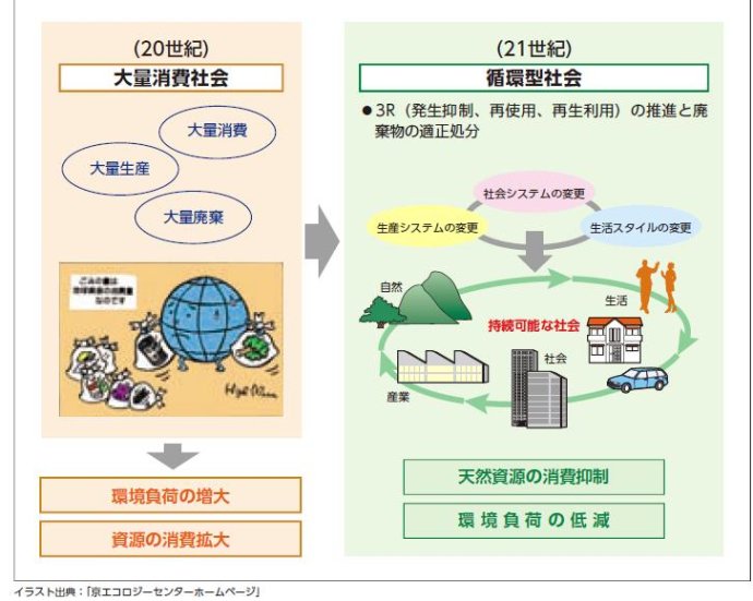 4)日本生活垃圾產(chǎn)生量的下降不是因為垃圾分類,而是改變消費模式。1997年到2007年是日本生活垃圾分類收集全面實施的10年,生活垃圾回收利用率從1997年11%提高到2007年20.3%,但生活垃圾的產(chǎn)生量并沒有明顯下降,1997年到2000年期間還有所增長,2000年達到最高值,2000年后開始有所下降,由人均生活垃圾日產(chǎn)生量1.132千克下降到0.90千克(2014年),巧合的是日本建設(shè)循環(huán)型社會的基本法正是從2000年開始實施的,有關(guān)建設(shè)循環(huán)型社會的要求明確要改變消費模式,即改變大量生產(chǎn)、大量消費、大量廢棄的模式(見下圖),明確提出抑制消費,減輕環(huán)境負(fù)荷;換句話說,減少消費才是減少社會垃圾產(chǎn)生的有效途徑。當(dāng)前,我國要真正實現(xiàn)生活垃圾減量,宏觀上就需要抑制消費,我們從思想上、心底里、現(xiàn)實條件中準(zhǔn)備好了嗎!想起一次會議上,來自歐洲的專家講,現(xiàn)代的綠色城市標(biāo)志是居民出行騎自行車;我與他們說,按照這樣的條件,在我國上世紀(jì)七十年代、八十年代許多城市都滿足這樣的條件,但顯然這不是大家所希望的。如今在歐洲等發(fā)達國家倡導(dǎo)綠色、低碳理念,提倡自行車出行符合這樣的理念當(dāng)然是正確的,但他們是在家家有車甚至人人有車的基礎(chǔ)上鼓勵少開車、多用自行車出行;如今我國正在邁入小汽車時代,交通擁堵已經(jīng)成為“城市病”特征,盡管如此,如果我們對一個還沒有開個車正在夢想擁有自己小汽車的人,去宣導(dǎo)少開車、不開車,為了綠色與低碳,他不認(rèn)為這樣的宣導(dǎo)是“有病”,也會認(rèn)為是可笑的。經(jīng)歷改變行為,釋迦摩尼曾經(jīng)是印度王子,在金錢、美女都有充分體會才去普度眾生。我們大多數(shù)人還奔跑在全面小康的路上,雖然部分人確實先富起來,但他們通過各類影視告訴大眾,什么是有錢人,有錢人吃剩了就扔,不會放在冰箱里;就是一些聲稱注重環(huán)保的名人代言環(huán)保廣告也公開呼吁喝小瓶裝的瓶裝水(為了減少浪費為未喝完的水,忘記了忽略了把未喝完的水帶著繼續(xù)喝),這與發(fā)達國家為減少包裝垃圾提倡喝大瓶裝的瓶裝水截然相反。千方百計擴大消費、想盡辦法誘導(dǎo)消費仍然是主旋律,耳邊又響起央視“小罐茶”的廣告……