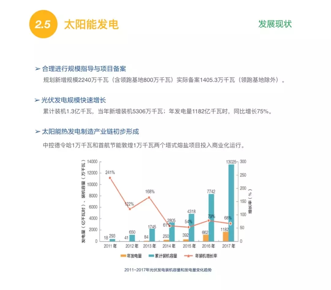 在太陽能發(fā)電方面,去年我國新增裝機(jī)5306萬千瓦,目前我國光伏發(fā)電累計(jì)裝機(jī)已達(dá)1.3億千瓦。同時(shí),我國太陽能熱發(fā)電制造產(chǎn)業(yè)鏈也初步形成。2017年太陽光伏發(fā)電投資規(guī)??焖僭鲩L,比2016年增長了41%,同時(shí)單位千瓦造價(jià)部分已經(jīng)降低至每千瓦5500元以下,棄光的現(xiàn)象也得到了有效控制。