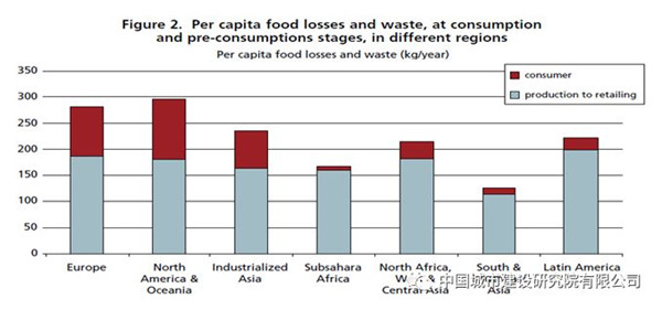 按人均計(jì)算,發(fā)達(dá)國家和地區(qū)人均食物廢棄量較高。歐洲與北美人均可食用的食物生產(chǎn)量900千克/年,損耗和廢棄量分別是280-300千克/年,其中廢棄量達(dá)到95-115千克/年,而非洲、南亞及東南亞低收入地區(qū)產(chǎn)量只有460千克/年,損耗和廢棄量分別是120-170千克/年,其中廢棄量只有6-11千克/年。