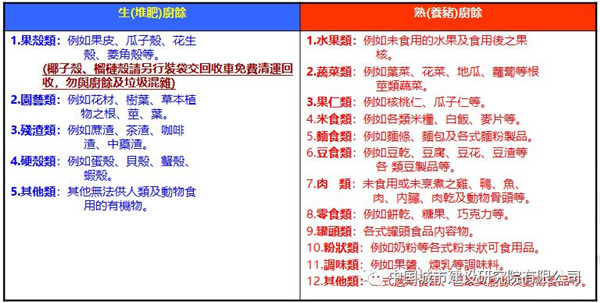 臺(tái)北市自2003年12月26日開始全面回收家庭廚余,家庭廚余分類為“養(yǎng)豬廚馀”及“堆肥廚馀”,詳細(xì)分類如上表所示。