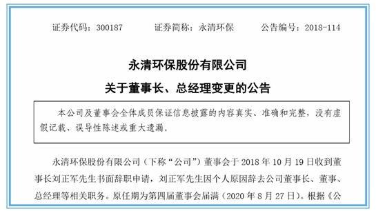 10月22日晚間,永清環(huán)保發(fā)布公告稱,董事會(huì)于10月19日收到董事長劉正軍的書面辭職申請(qǐng),劉正軍因個(gè)人原因辭去公司董事長、董事、總經(jīng)理等相關(guān)職務(wù)。辭職后,劉正軍先生不再擔(dān)任公司其他職務(wù)。
