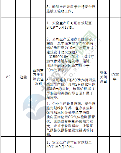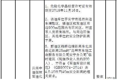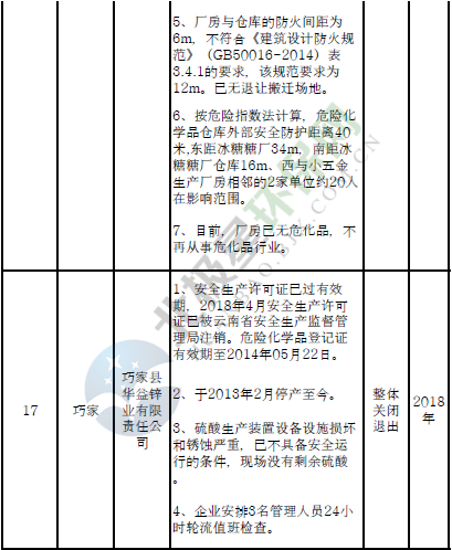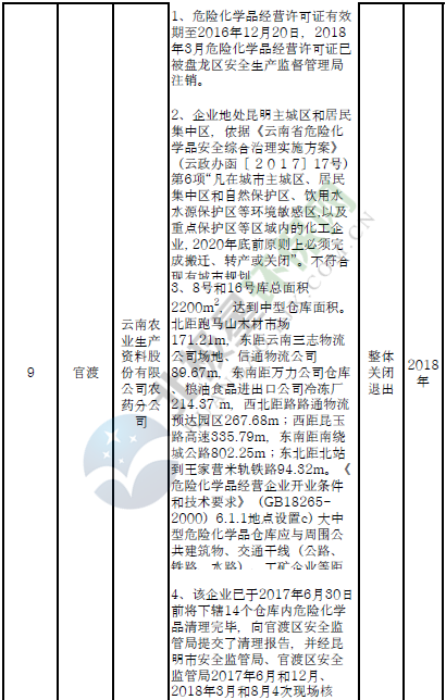 四、對(duì)8戶(詳見附件3)位于人員密集區(qū)、安全距離不足、工藝技術(shù)落后、存在重大隱患的危險(xiǎn)化學(xué)品生產(chǎn)(儲(chǔ)存)企業(yè)進(jìn)行綜合整治,2020年底前全部完成,各相關(guān)企業(yè)具體完成時(shí)間由各州市政府結(jié)合本地實(shí)際確定。各州市政府要統(tǒng)籌制定重大隱患綜合整治方案,做到“一企一方案”并報(bào)省安委會(huì)辦公室。其中:昆明市2戶,曲靖市1戶,玉溪市1戶,楚雄州1戶,文山州1戶,西雙版納州1戶,大理州1戶。