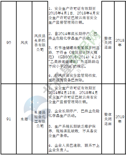 對(duì)91戶危險(xiǎn)化學(xué)品生產(chǎn)(儲(chǔ)存)企業(yè)和部分生產(chǎn)裝置,雖不在城鎮(zhèn)人口密集區(qū),但由于不符合產(chǎn)業(yè)政策、不具備基本安全生產(chǎn)條件且無法整改的,實(shí)施關(guān)閉退出。