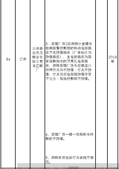 五、涉及重點(diǎn)監(jiān)管危險(xiǎn)化工工藝的43戶企業(yè)、涉及重點(diǎn)監(jiān)管危險(xiǎn)化學(xué)品的107戶企業(yè)以及213個(gè)重大危險(xiǎn)源,各州市政府根據(jù)具體情況組織進(jìn)行整改。2019年10月底完成自動(dòng)化控制和安全儀表系統(tǒng)改造升級(jí)工作。2019年10月底,未單獨(dú)設(shè)置控制室的乙醇生產(chǎn)企業(yè)按照規(guī)程要求完成改造,酒精生產(chǎn)車間的易燃易爆氣體檢測(cè)報(bào)警儀與通風(fēng)風(fēng)機(jī)實(shí)現(xiàn)聯(lián)鎖。