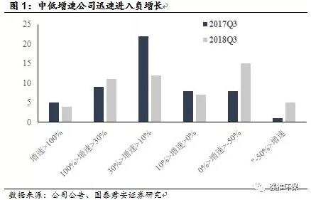 將板塊內(nèi)55個(gè)標(biāo)的2017Q3與2018Q3扣非凈利潤增速,列示如圖2與圖3。其中,中低增速區(qū)間的公司(增速10%~30%)顯著減少,進(jìn)入負(fù)增長的企業(yè)顯著增多。不同企業(yè)之間的分化愈演愈烈。