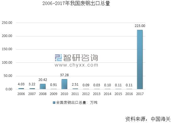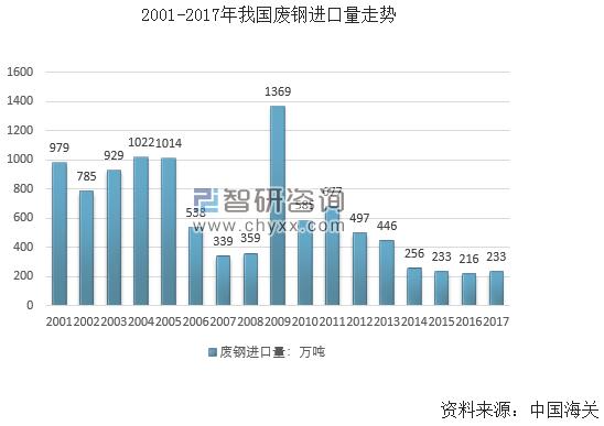 近年來,我國鋼鐵在我國鋼鐵產(chǎn)能過剩的大背景下,我國廢鋼進口量自2009-2012年后,逐年走低,進口資源所占比例不斷減小,2017年,我國廢鋼進口量大約為233萬噸。2016年為216萬噸,進口量小幅回升。