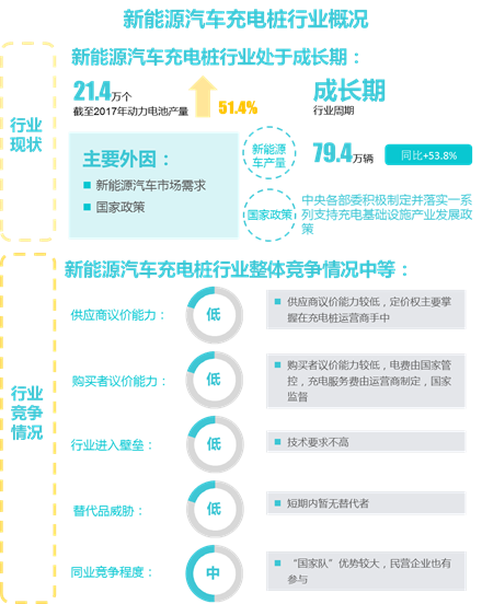 整體而言,新能源汽車充電樁行業(yè)供應商議價以及購買者能力較低,定價權主要由充電樁運營商決定,其中運營商制定的服務費和電價由國家管控。由于該行業(yè)技術要求不高,進入壁壘較低,但需要滿足一定的軟性條件才可進入投標體系。此外,行業(yè)暫時沒有替代品,同業(yè)競爭程度為中等。綜上,我國新能源車充電樁行業(yè)競爭程度為中等,“國家隊”優(yōu)勢較大。