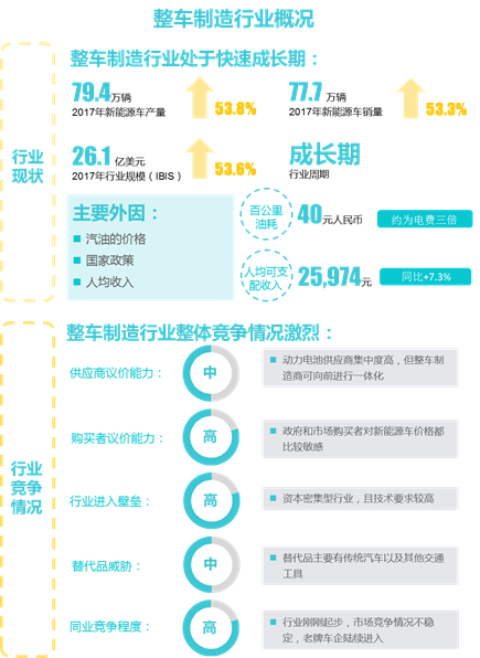 近幾年來我國新能源整車制造行業(yè)規(guī)模高速增長。根據(jù)中國汽車工業(yè)協(xié)會數(shù)據(jù),2017年中國新能源汽車產(chǎn)量為79.4萬輛,銷量為77.7萬輛,同比分別增長53.8%和53.3%,新能源汽車整車制造業(yè)近五年來一直保持高增速,汽車工業(yè)協(xié)會預計到2025年新能源車的市場占比將會達到15%。