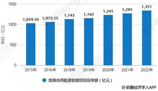 2015年,我國合同能源管理項目投資額為1039.56億元,同比增長8.43%。到了2016年我國合同能源管理項目投資額為1073.55億元,同比增長3.27%。綜合以上因素,預(yù)計2018年我國合同能源管理項目投資額將達(dá)到1143億元,未來五年(2018-2022)年均復(fù)合增長率約為4.26%,預(yù)測到了2022年我國合同能源管理項目投資額將達(dá)到1351億元。