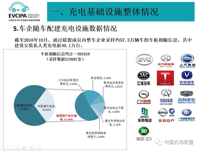 截至2018年10月,通過聯(lián)盟成員內(nèi)整車企業(yè)采樣約57.3萬輛車的車樁相隨信息,其中建設(shè)安裝私人類充電樁40.1萬臺(tái)。
