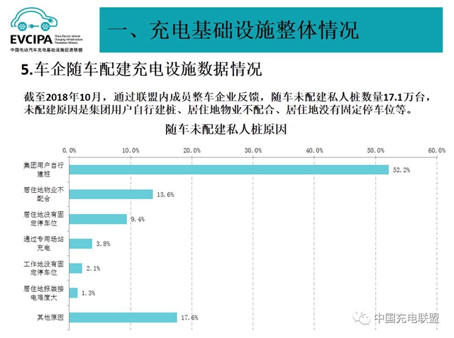 截至2018年10月,通過聯(lián)盟內(nèi)成員整車企業(yè)反饋,隨車未配建私人樁數(shù)量17.1萬臺(tái),未配建原因是集團(tuán)用戶自行建樁、居住地物業(yè)不配合、居住地沒有固定停車位等。