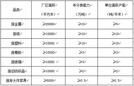 指分揀品類不少于二類,分揀能力和用地面積規(guī)劃設計,應以再生資源分揀用地標準和本區(qū)域再生資源實際產(chǎn)生量為準。可分為大、中、小型三個級別,各級別綜合型分揀中心的年分揀能力和廠區(qū)面積如下: