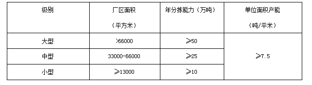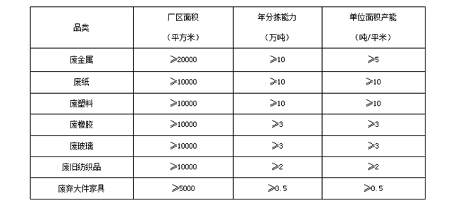 指分揀品類不少于二類,分揀能力和用地面積規(guī)劃設(shè)計(jì),應(yīng)以再生資源分揀用地標(biāo)準(zhǔn)和本區(qū)域再生資源實(shí)際產(chǎn)生量為準(zhǔn)。可分為大、中、小型三個級別,各級別綜合型分揀中心的年分揀能力和廠區(qū)面積如下: